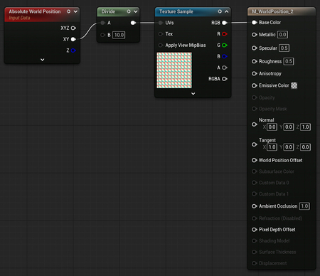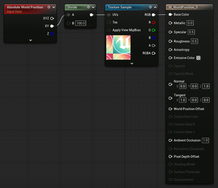 Теперь попробуем привязать Absolute World Position к Texture Sample, а затем к самому материалу.