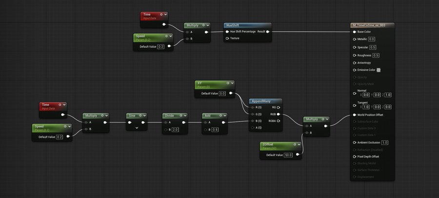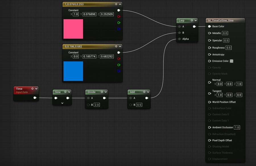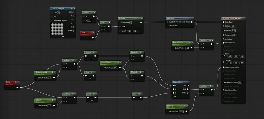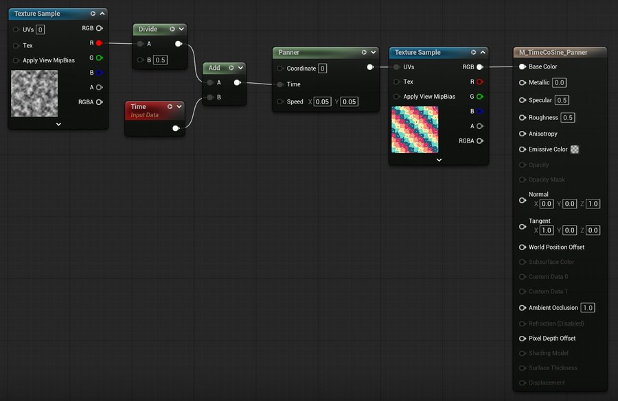 Time является одним из ключевых аспектов для создания динамически изменяющихся материалов, к примеру, совместно с нодами Panner, Sine или другими, зависящими от времени, операторами.
