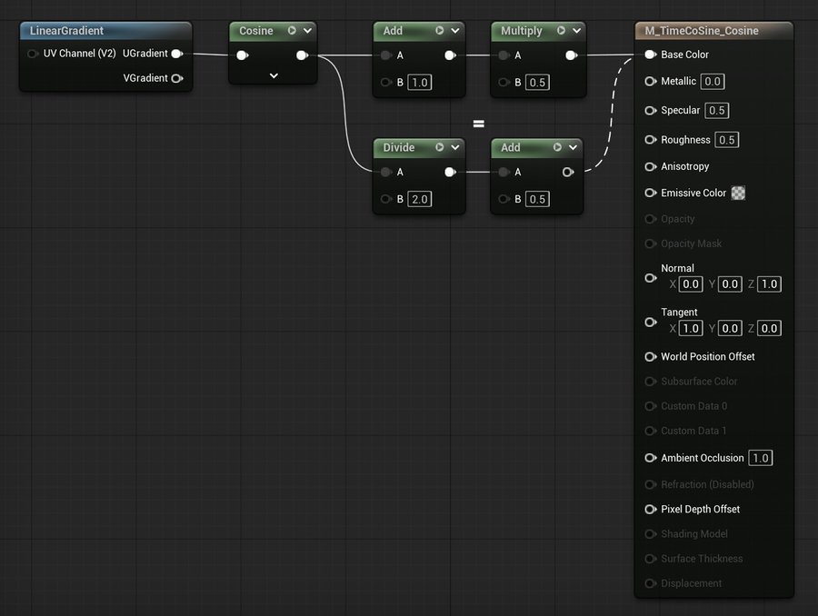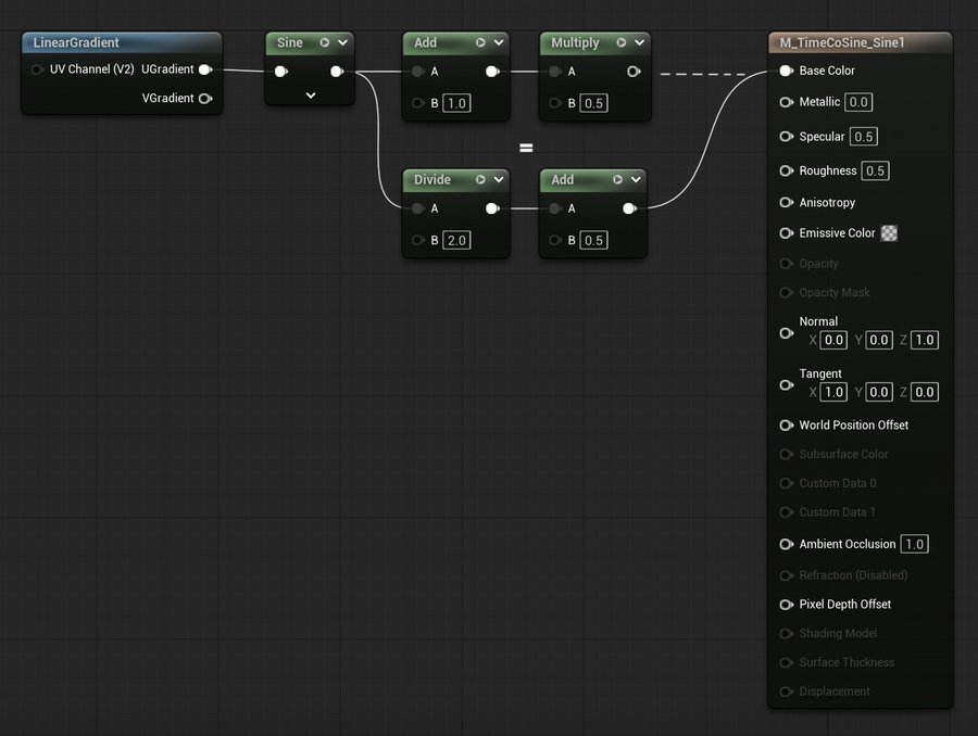 LinearGradient, подключенный в Sine и Cosine, а затем в Base Color.