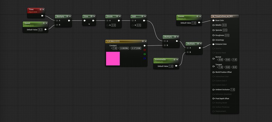 Нода Time прекрасно сочетается с тригонометрическими функциями Sine и Cosine для создания зацикленных эффектов. Эти две ноды выводят колеблющееся между -1 и 1 значения, что помогает создать «пульсирующие» эффекты.
