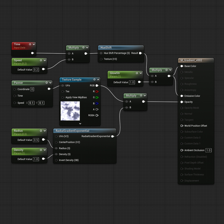 Gradient позволяет создавать плавные переходы, которые можно использовать, например, как маски для контроля проявления эффектов в определённых местах, для смешивания материалов, чтобы процедурно разнообразить схожие ассеты на уровне, даже для создания паттернов для спецэффектов.