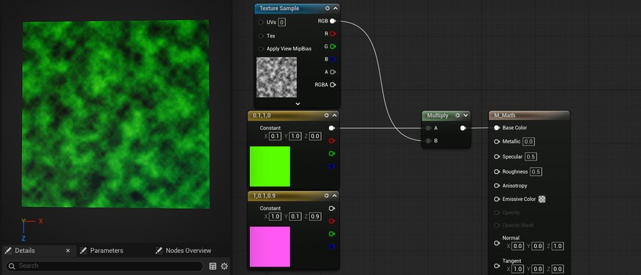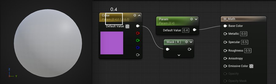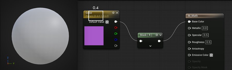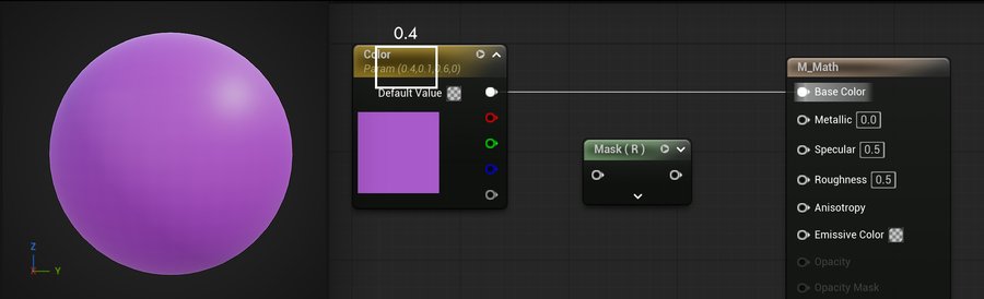 Если обратить внимание на Color, можно заметить, что цвет записан с помощью трехканального вектора (0.4, 0.1, 0,6). Если применять маску к R каналу, выводится значение 0.4, что равноценно тому, если бы была добавлена константа со значением 0.4.