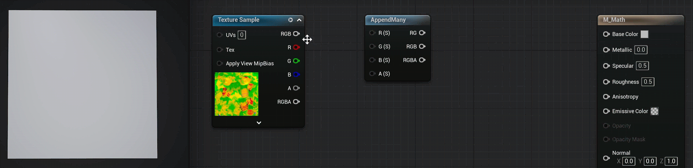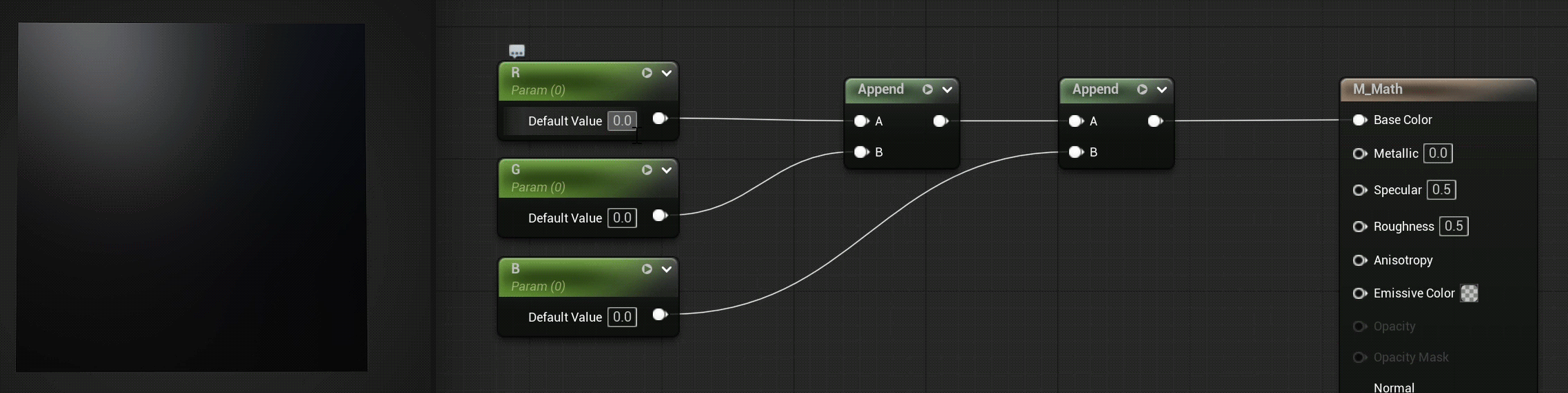 Первый инпут Append задает канал R, второй G, подключение результата к следующей ноде Append и добавление еще одного значения задает B канал.