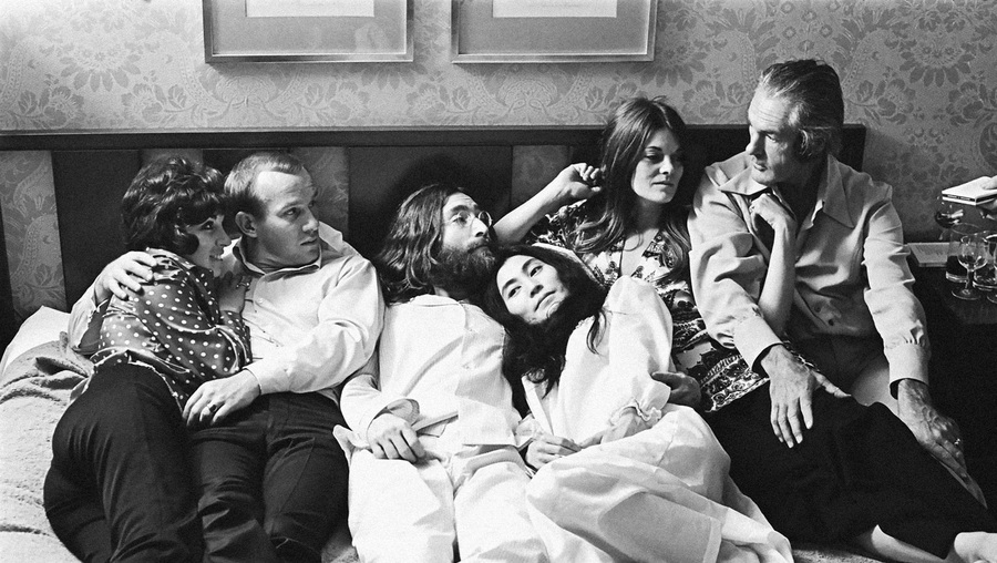 Джон Леннон и его жена Йоко Оно во время медового месяца в Амстердаме, 1969 год