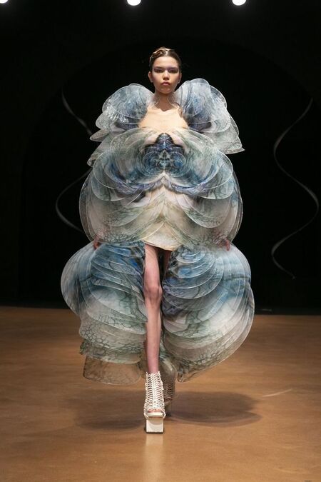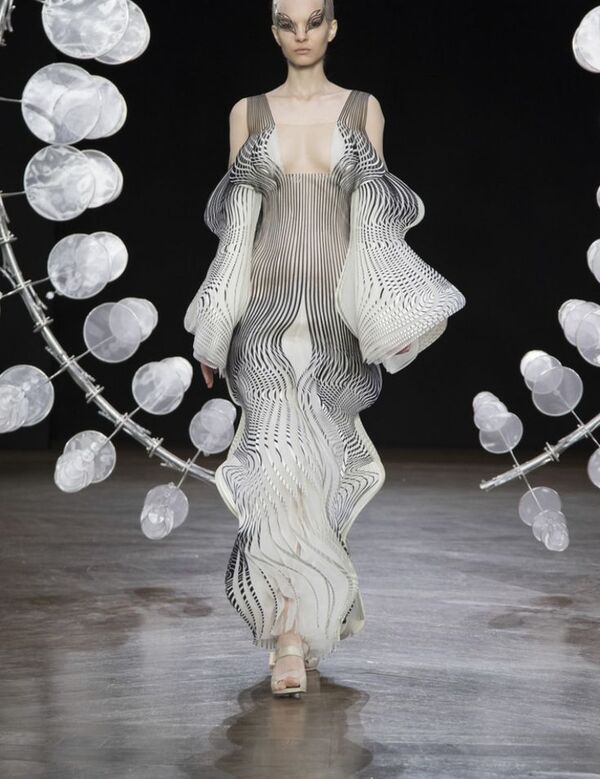 Iris van Herpen — это самый яркий пример биоморфизма в дизайне в одежды. Бренд Iris van Herpen известен своими инновационными и экспериментальными коллекциями, которые сочетают искусство, моду и технологии. Основательница бренда, Айрис ван Херпен, известна своим уникальным подходом к дизайну, который сочетает в себе элементы архитектуры, науки и природы.