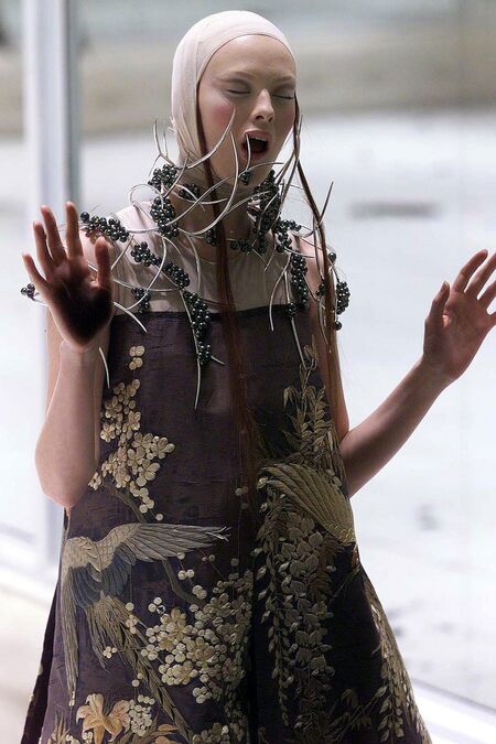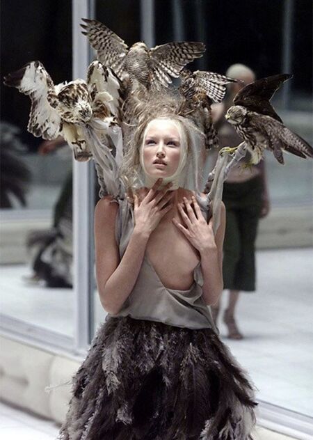Коллекция «VOSS» (2001) — одна из самых культовых в творчестве McQueen. Здесь дизайнер рассуждает на темы безумия, контроля и трансформации. Наряды, вдохновлённые природой: перья, ткани, напоминающие кожу, флористические мотивы. Платья с элементами крыльев насекомых или панцирей животных.