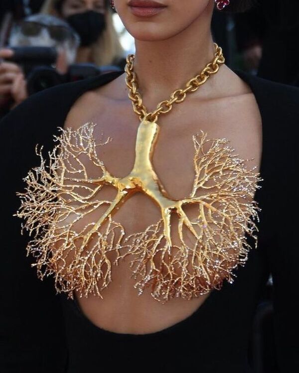 слева: Schiaparelli Fall 2024; справа: Bella Hadid на Festival de Cannes 2021
