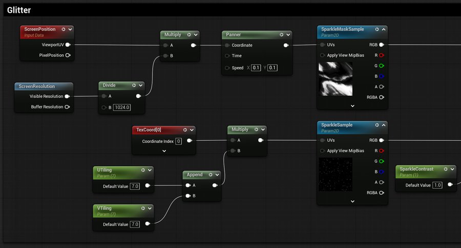 Во второй половине кода задается текстура блесток, к которой подключены контролирующие тайлинг параметры.