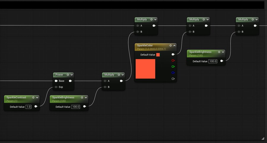Результат работы по созданию блесток подключается к Emissive Color. Также по необходимости добавляются дополнительные модификаторы цвета, яркости, контрастности.