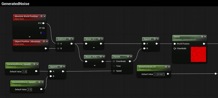 Данная часть нод создает анимированный шумовой паттерн для управления деформацией геометрии через World Position Offset.