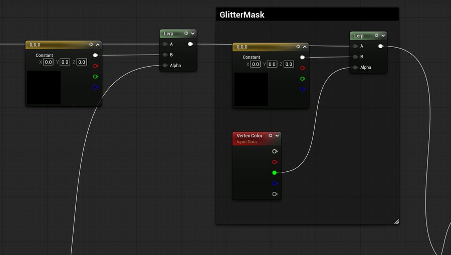 Основным отличием прошлого шейдера от измененного является добавление двух вертексных масок на паттерн шума и на сверкающие частицы [Glitter Mask], а вместе с этим изменение структуры подключения некоторых составляющих шейдера.