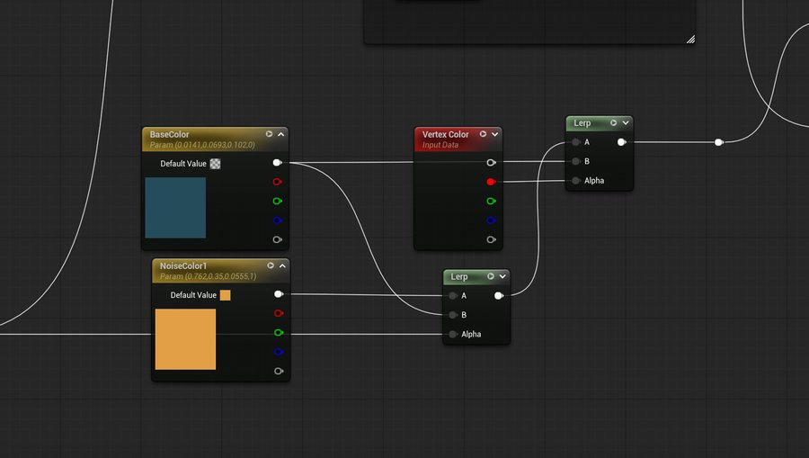 Для того, чтобы паттерн шума отработал правильно, было принято решение 2 раза использовать Lerp вместе с Base Color-ом, чтобы в первом случае маска Noise не дала черных пятен, а во втором, чтобы задать цвет базового материала, еще не подвергнутого влиянию G канала с паттерном.