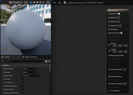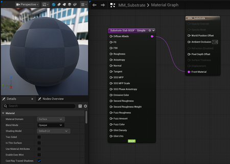 При создании нового шейдера граф будет похож на обыкновенный материал, однако стоит только добавить Substrate Slub или иной компонент сабстрейт материалов и подключить его к Front Material, как нода вывода поменяется.