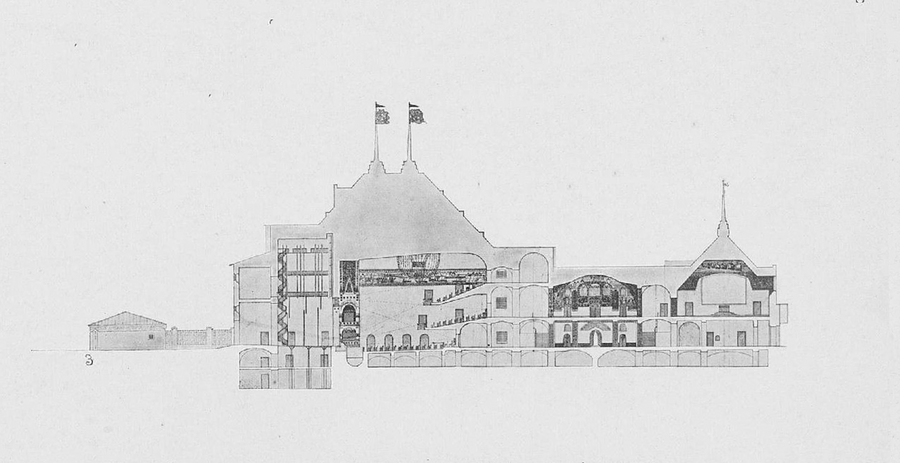 Конкурс народного дома Аксакова в Уфе, 1909, 3-я премия, архитектор В. А. Покровский, фасад Конкурс народного дома Аксакова в Уфе, 1909, 3-я премия, архитектор В. А. Покровский, разрез