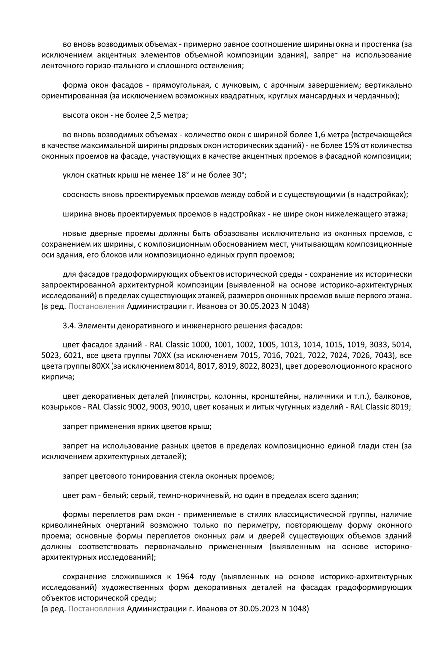 Регламентирована и архитектурная композиция фасадов: «во вновь возводимых объемах — поэтажное членение фасадов с высотой этажа не более 4 метров; высота цоколя — не более 1,2 метра; примерно равное соотношение ширины окна и простенка, запрет на использование ленточного горизонтального и сплошного остекления; форма окон фасадов — прямоугольная, с лучковым, с арочным завершением; вертикально ориентированная (за исключением возможных квадратных, круглых мансардных и чердачных); высота окон — не более 2,5 метра», уклон скатных крыш 18-30°.