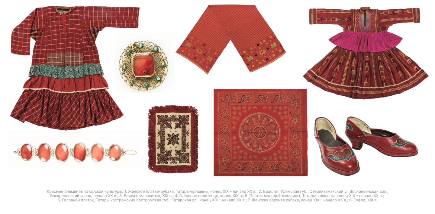 В традиционной татарской культуре красный используется повсеместно: он встречается в тканях одежды (платья, кафтан, камзол), в обуви, в головных уборах, в платках, украшениях и в праздничной одежде. Красный — знак торжества, праздника, силы и энергии. Этот цвет становится культурным маркером: в сочетании с другими элементами культуры — вышивка, орнамент, аксессуары — он часто воспринимается как этнический и как символ принадлежности к культуре.