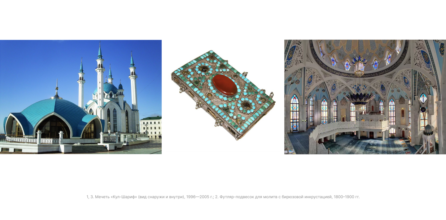 Бирюзовый Бирюзовый — один из наиболее заметных дополнительных цветов татарской культуры. Он присутствует в архитектуре мечетей XIX–XX вв. (купола, элементы интерьера), а также в традиционных украшениях, где бирюза использовалась как один из самых популярных вставных камней. Благодаря регулярному повторению в материальной культуре, бирюзовый стал устойчивым символом: это цвет камня и одновременно цвет небесной чистоты, создающий характерный холодный акцент, особенно в религиозной среде.