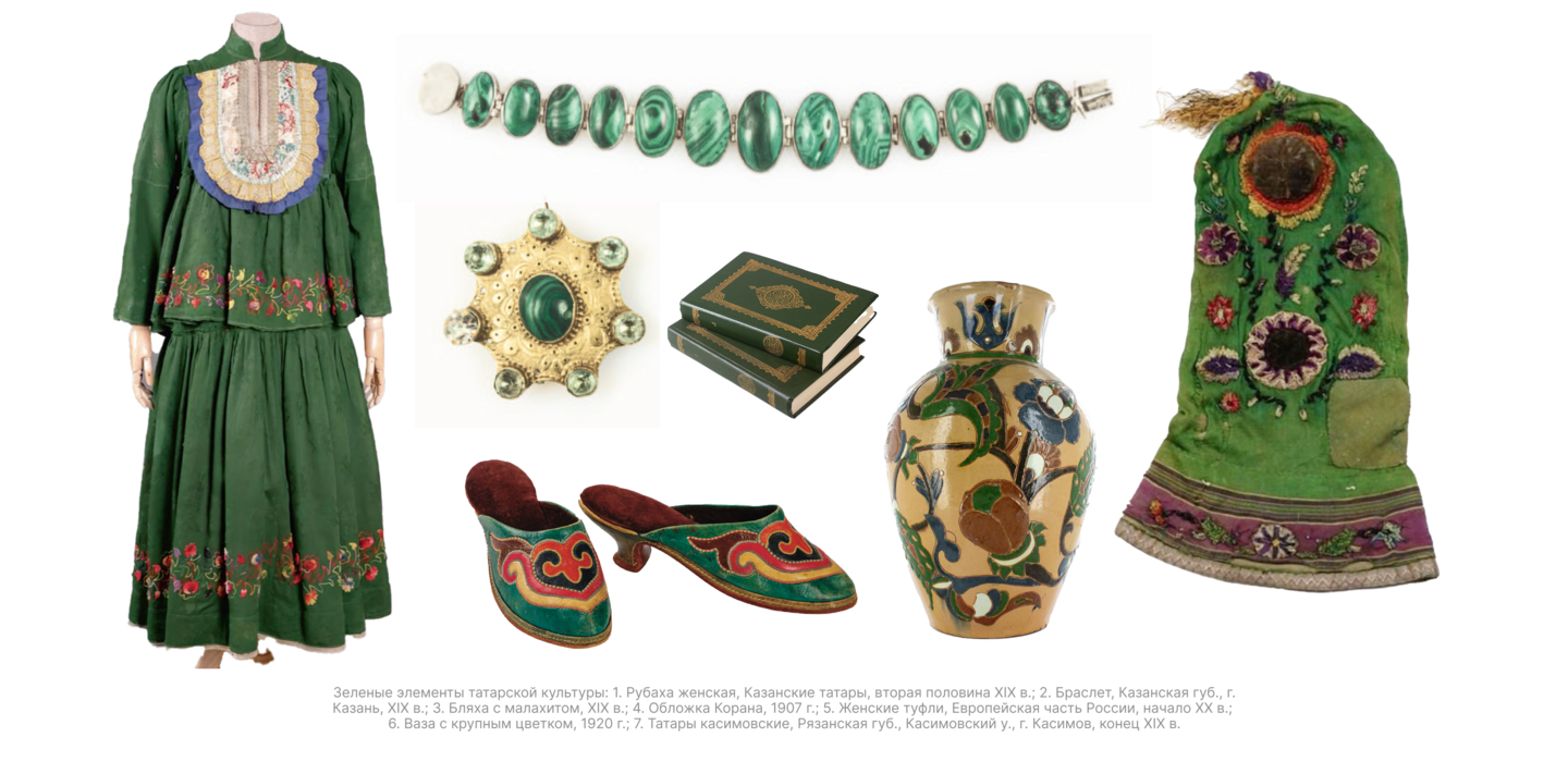 Для татарской культуры зелёный важен как государственный, так и культурный символ: зелёные ткани, шёлковые, бархатные, ткани для тюбетеек, головных уборов, украшений и праздничных костюмов — такие материалы часто использовались мастерами при изготовлении традиционной одежды.