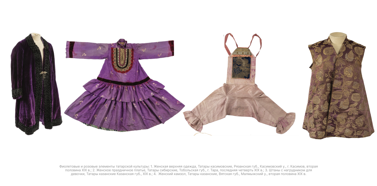 Фиолетовый / лиловый / вишнёвый (роховый) Фиолетовый и его оттенки — частые цвета тканей праздничной и национальной одежды. Бархат таких оттенков использовался для камзолов, платьев, тюбетеек и калфаков. Эти оттенки ассоциируются с благородством и статусностью, так как бархат фиолетово-вишнёвых тонов был дорогим и считался престижным материалом, что закрепило фиолетовый как цвет торжества и статуса в татарской культуре.