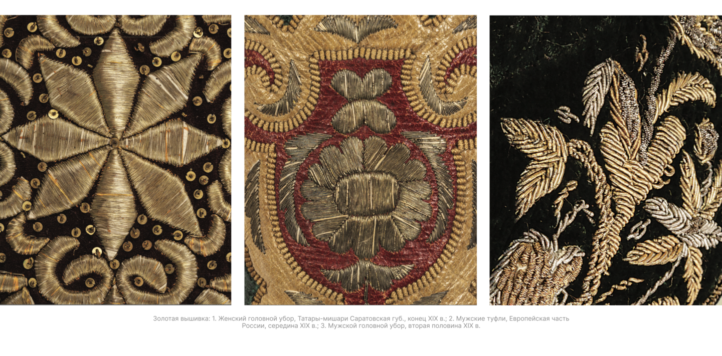 Татарская техника Золотного шитья (чаще — на бархате, парче, коже) была и остаётся важнейшим видом декоративно-прикладного искусства: золото (или позолоченные металлы) применялись при вышивке головных уборов (калфак, тюбетейка), одежды, обуви, аксессуаров. Золотой цвет ассоциировался с благородством, богатством, статусом, торжественностью и красотой — те значения, которые в культуре часто приписывались знатным, праздничным нарядам, ритуальным или обрядовым вещам.