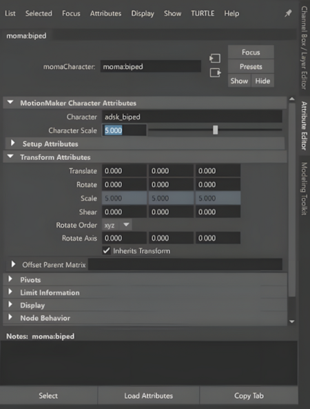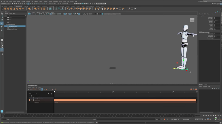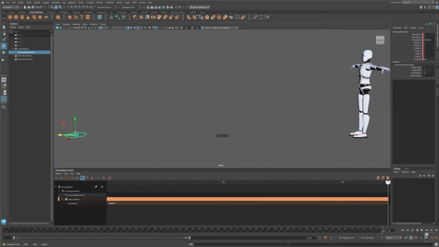 — Открыть MotionMaker во вкладке Windows — Импортировать двуногого персонажа — Локатор траектории поможет создать путь для персонажа — локатор нужно переместить из стартовой точки в конечную — Нажать кнопку генерации движения