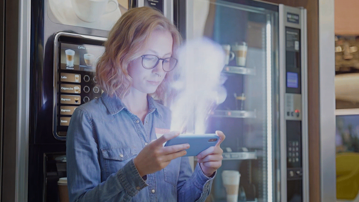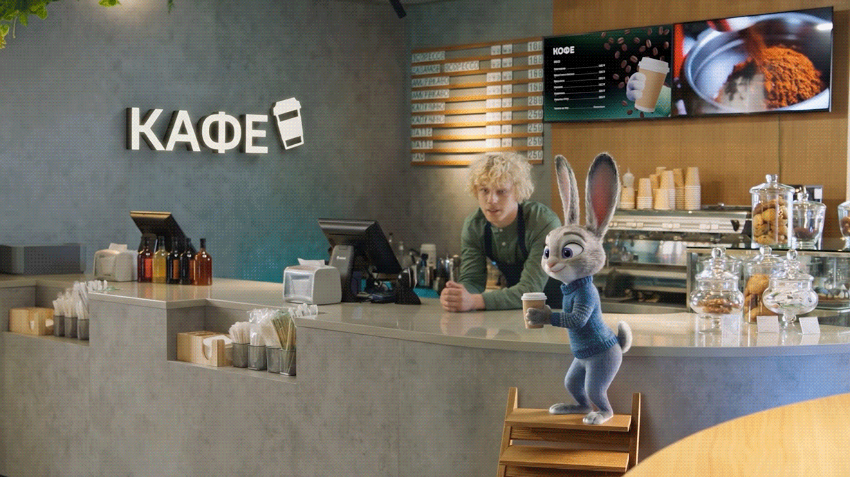 Для плавного перехода на монтаже так же необходимо было подобрать кадры так, чтобы голограмма была как бы на 1 кадр дальше по движению, чем предыдущий в кофейне.