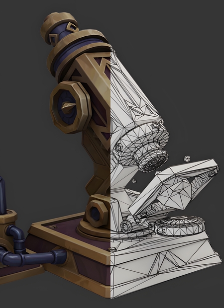 Для создания high-poly модели используются инструменты скульптинга, направленные на формирование детализированной основы, которая впоследствии передается на low-poly модель через запекание карты нормалей. Этот подход позволяет сохранять оптимизированную полигональную сетку финальной модели и переносить сложный рельеф и микродетали на low-poly геометрию.