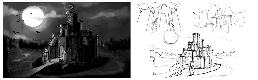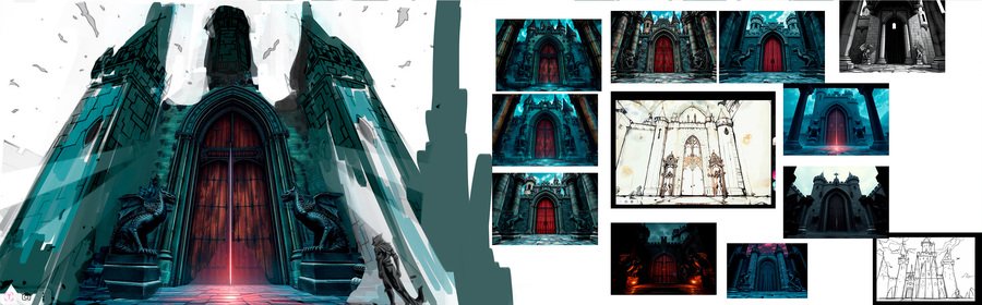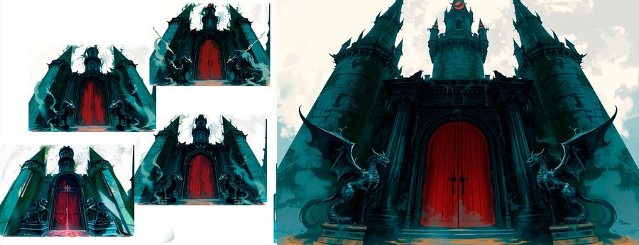 Замок Алхимика • Архитектура власти Внешний облик замка строится на принципе «угрожающей симметрии». Монументальный фасад из темного камня создает ощущение непреодолимой мощи, а острые шпили визуально усиливают вертикальную доминанту. Цветовая палитра основана на глубоких синих тонах, символизирующих рациональное знание, контрастирующих с алым свечением входа как метафорой скрытой опасности.
