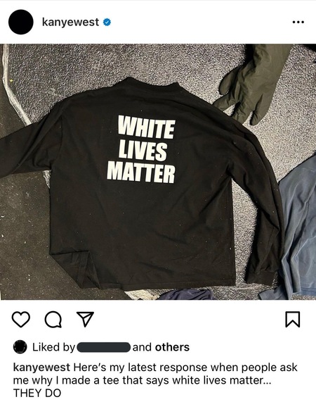 В 2022 году в рамках показа коллекции YZY SZN 9 (Ye / Yeezy Season 9) на парижской неделе моды Канье вышел на публику в футболке с надписью «White Lives Matter». Сам Канье прямо говорил, что движение Black Lives Matter (Жизни черных имеют значение) стало инструментом манипуляции и коммерциализации: «Black Lives Matter was a scam».