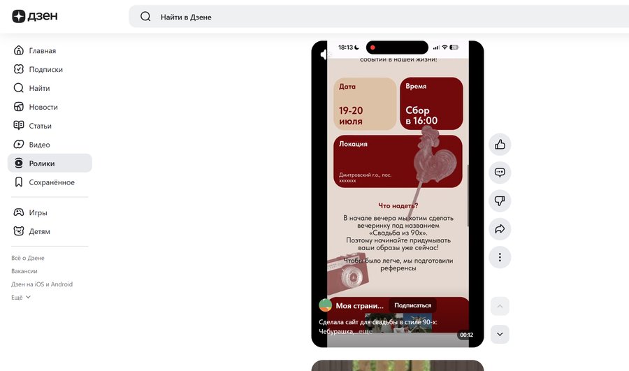 Видео о сайте для свадьбы в стиле 90-х на Дзене