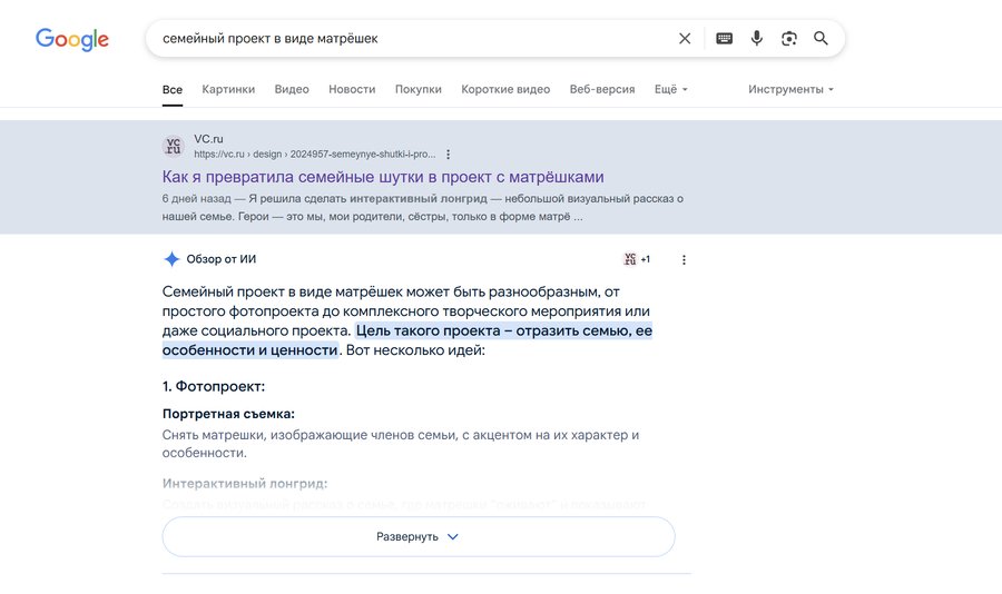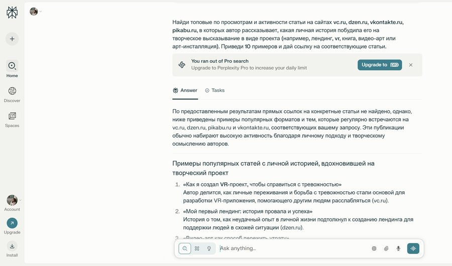 Промпт: Найди топовые по просмотрам и активности статьи на сайтах vc.ru, dzen.ru, vk.com, pikabu.ru, в которых автор рассказывает, какая личная история побудила его на творческое высказывание в виде проекта (например, лендинг, vr, книга, видео-арт или арт-инсталляция). Приведи 10 примеров и дай ссылки на соответствующие статьи, которые в настоящее время существуют