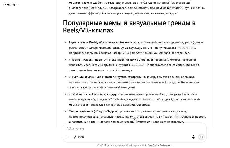 Я запросила у ChatGPT анализ моей целевой аудитории, а также трендовых роликов в ВК клипах и запрещенной сети.