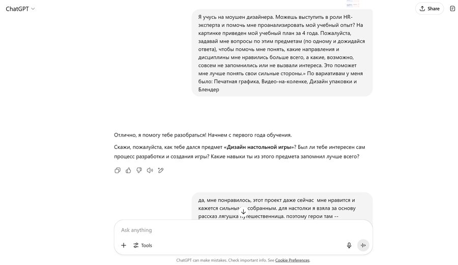 Промпты: Я учусь на моушен дизайнера. Можешь выступить в роли HR-эксперта и помочь мне проанализировать мой учебный опыт? На картинке приведен мой учебный план за 4 года. Пожалуйста, задавай мне вопросы по этим предметам (по одному и дожидайся ответа), чтобы помочь мне понять, какие направления и дисциплины мне нравились больше всего, а какие, возможно, совсем не запомнились или не вызвали интереса. Это поможет мне лучше понять свои сильные стороны.