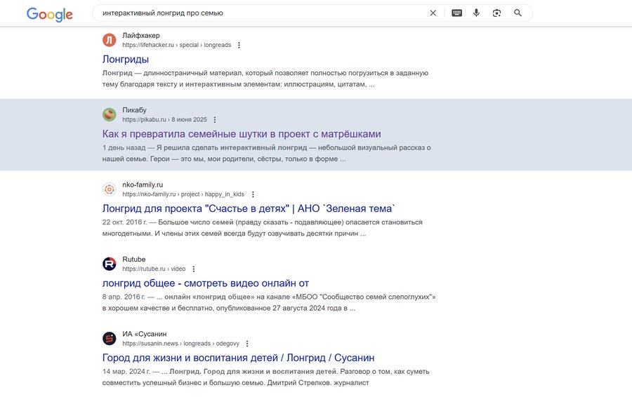 Благодаря своему опыту, я создала такой проект: Я создала лонгрид о многодетной семье, основываясь на своей и написала туда шуточные правила семьи. Повествование ведется о большой семье Грелкиных. Герои представлены в виде матрешек, на чем акцентируется внимание, когда зритель знакомится с ними. Несмотря на то, что все члены семьи похожи между собой, все они обладают совершенно разными качествами. ПРОТОТИПАМИ ВСЕХ ПЕРСОНАЖЕЙ СТАЛА МОЯ СЕМЬЯ. Зрителю позволяют заглянуть в мир Грелкиных и узнать, как проходит их обычный день. В течение дня матрешки следуют определенным правилам, которые возникли в семье сами собой. Все ситуации сопровождаются яркими анимационными и статичными иллюстрациями. вот сам лонгрид: https://readymag.website/hseadc1/PVVMS/