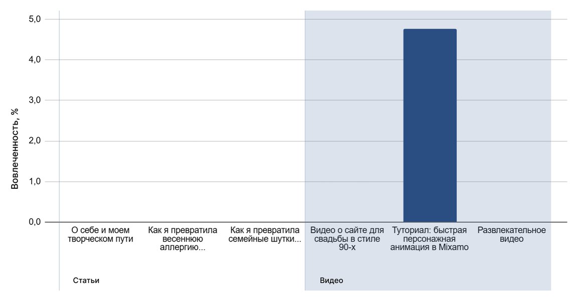 На YouTube, напротив, максимально выстрелили визуально привлекательные и оригинальные сюжеты — в первую очередь видео о сайте для свадьбы в стиле 90-х, которое получило как самый большой охват, так и наивысшую вовлечённость. Это подчёркивает, что для YouTube ключевую роль играет уникальность идеи и эмоциональный визуальный образ. Развлекательный контент показал стабильные результаты, а обучающий туториал оказался нишевым — его смотрят заинтересованные, но не массово. Таким образом, зрителю YouTube важна подача и вау-эффект, тогда как на VC — искренность и история.