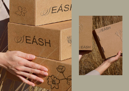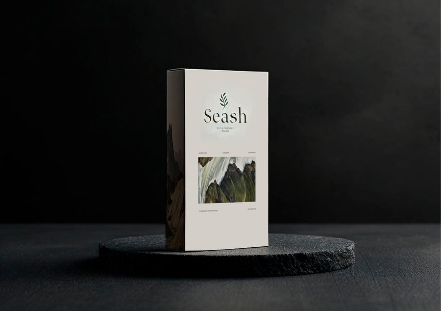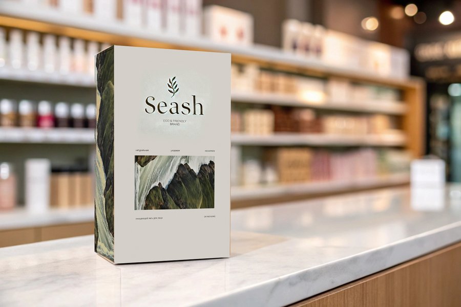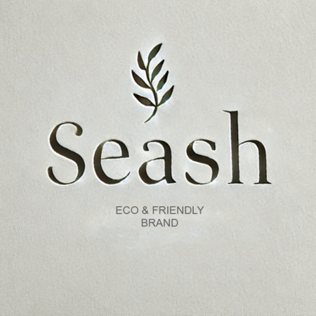 Логотип: Созданный в нейросети DALL·E (от OpenAI) Промт: Create a minimalistic logo for the brand with the name seash (the name must be included in the logo). Use a sleek, sophisticated font, combining classic elements like the example (such as swirls or handwritten elements) with modern, strict lines. Add an emphasis on eco-friendliness and naturalness. The color palette should be soft and natural-green, beige, white or black. The logo should look premium and aesthetically pleasing, reflecting the brand’s cleanliness and environmental responsibility. Мелкая типографика вставлена в фотошопе шрифтом Arial