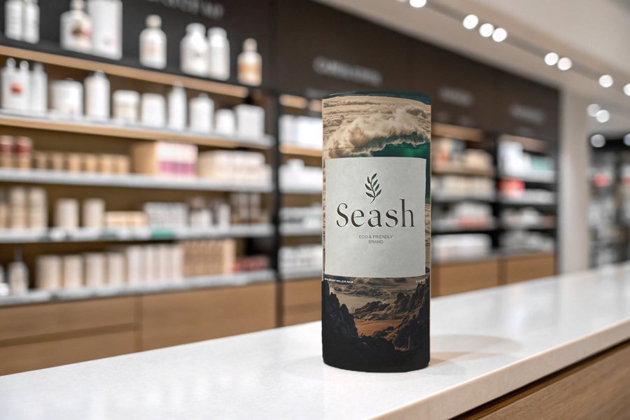 Промт в recraft.ai для генерации мокапа: «A cylindrical cardboard tube is standing on a countertop in a cosmetics store. The focus is on the tube in the foreground, highlighting its texture and details. The background is slightly blurred to reveal shelves with cosmetic products, creating the atmosphere of a stylish, modern store. The lighting is soft, with an emphasis on the packaging, enhancing its premium appearance»