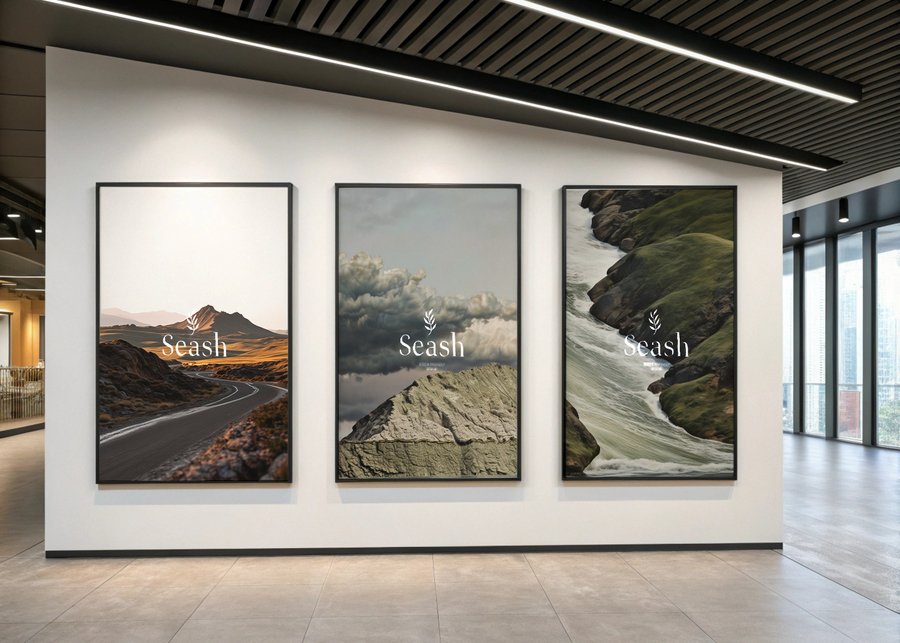 Промт в recraft.ai для генерации мокапа: «Create a mockup featuring three posters displayed in a row on a wall. Each poster has a minimalist design with no text or logos. The posters are framed and placed evenly spaced on a clean, modern wall, with natural lighting that highlights the texture and details of the posters. The background should be a simple, neutral-colored interior, such as a gallery or stylish office space, emphasizing the elegance and professionalism of the presentation. The overall scene should convey a contemporary and sophisticated atmosphere.»