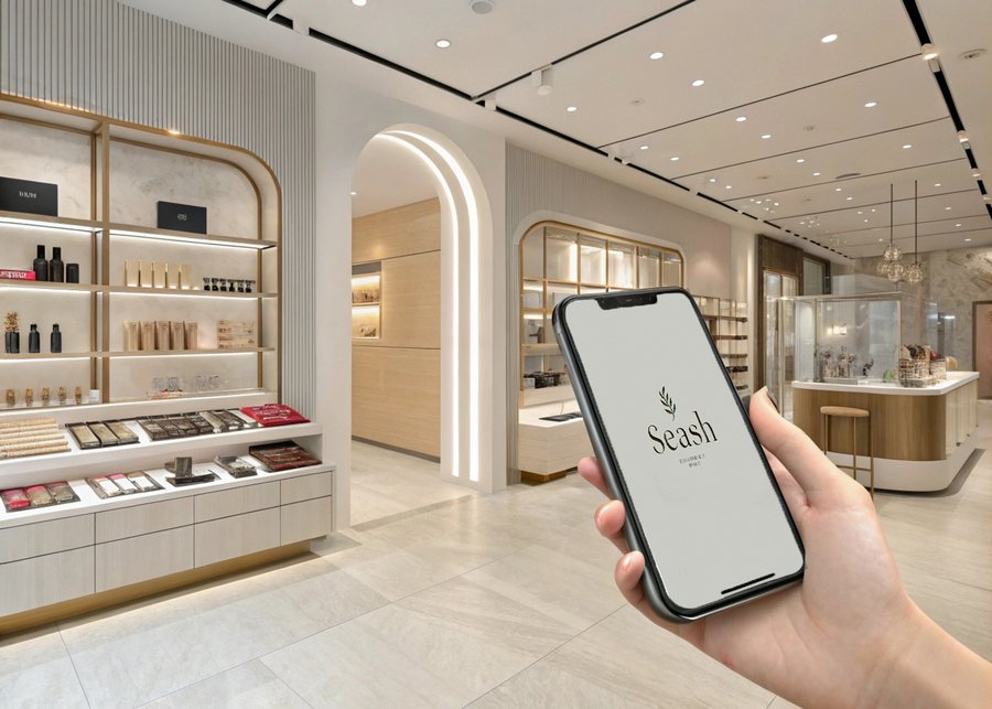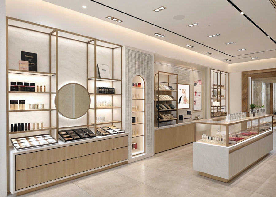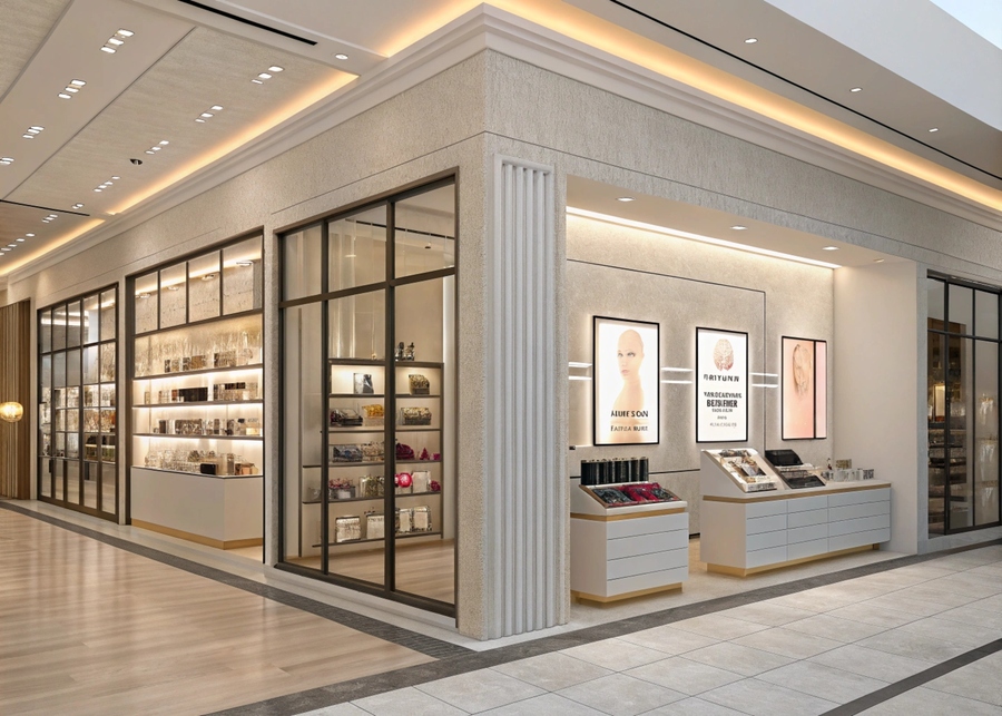 Промт в recraft.ai для генерации картинки: «Create a mockup of a retail space for a powdered cosmetics store. The store should have modern, clean lines with minimalist design elements, emphasizing elegance and sophistication. Display shelves are neatly arranged with various powdered cosmetic products, such as loose powders, blushes, and foundations, in sleek, high-quality packaging. The interior should feature neutral tones like soft whites, beige, and light wood accents. Soft, ambient lighting creates a warm and inviting atmosphere, with a focal point on the product displays. The overall design should convey luxury, eco-consciousness, and a professional aesthetic.»