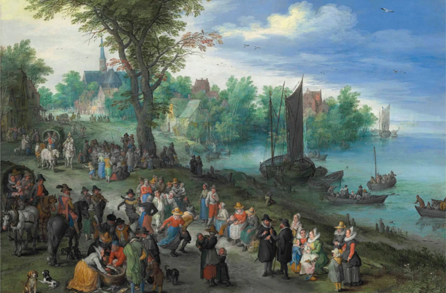 Ян Брейгель Старший, «Танцующие фигуры на берегу реки с продавцом рыбы и портретом художника на переднем плане», 1616