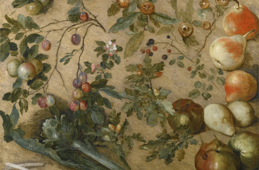 Ян Брейгель Старший, «Этюд: яблоки, груши, виноград, ежевика, артишок, спаржа и веточка дуба», 1620-е