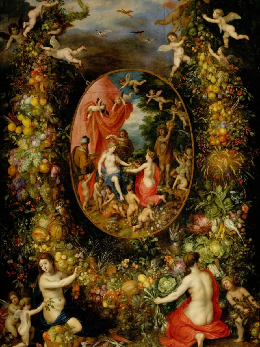 Ян Брейгель Старший (совм. с Хендриком ван Баленом), «Гирлянда фруктов с Кибелой, получающей дары от персонификации четырех сезонов», ок. 1622