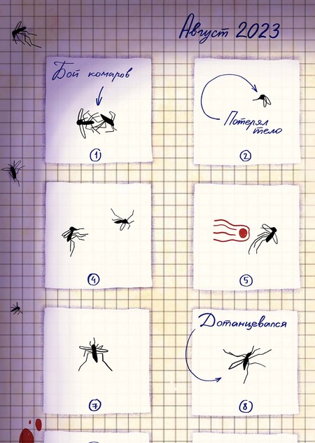 Коллекция человека, который ловит на протяжении августа 2023 года ловил комаров и складывал их в тетрадь, нумеруя по порядку и дополняя «комарарий» комментариями и рисунками.