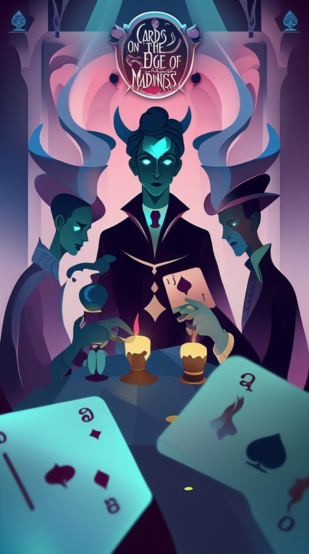 Промпт: Create a detailed mockup for the board game titled 'Cards on the Edge of Madness, ' inspired by Alexander Pushkin’s story 'The Queen of Spades.' The mockup should feature a beautifully designed game board that captures the opulent yet eerie atmosphere of a 19th-century salon, complete with intricate patterns and dark, rich colors.Include a set of playing cards that reflect the themes of the game, showcasing unique artwork for each card that depicts characters and symbols from the story, such as Hermann, the Countess, and the fateful three cards. The cards should have an ornate design, with gold accents and gothic motifs. Add game pieces that represent the players, designed as elegant miniatures that embody the essence of the characters in the tale. These pieces should be intricately detailed, perhaps featuring Hermann in a contemplative pose and the Countess with an air of mystery. Incorporate tokens or chips that symbolize madness and fate, designed with unique illustrations that tie back to the narrative. Place everything on a visually appealing background that enhances the overall theme, such as a dimly lit room with flickering candlelight.