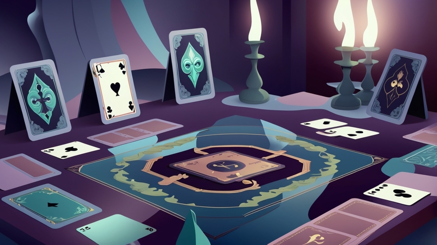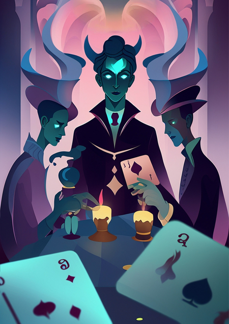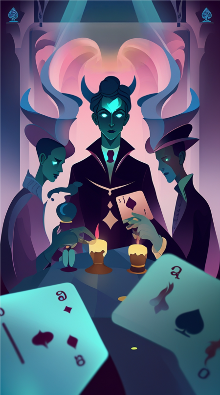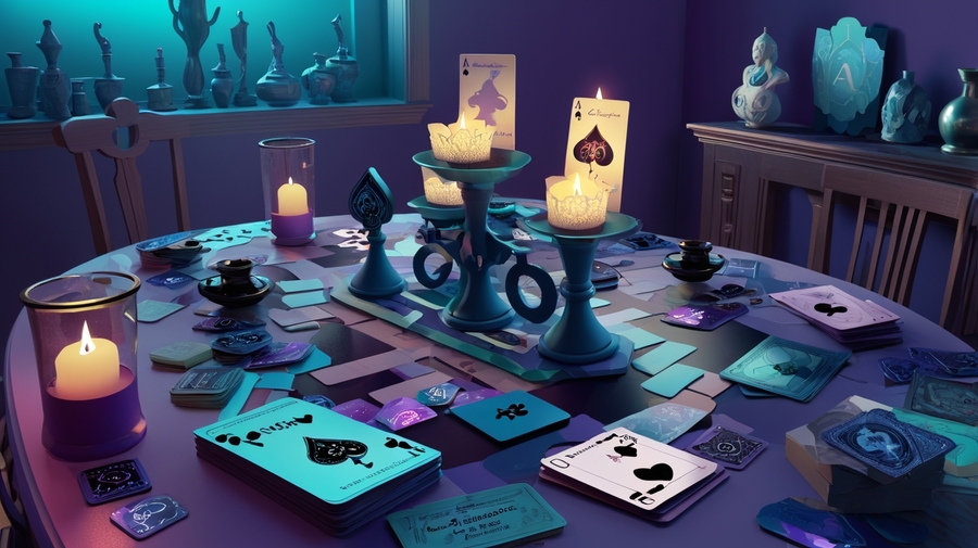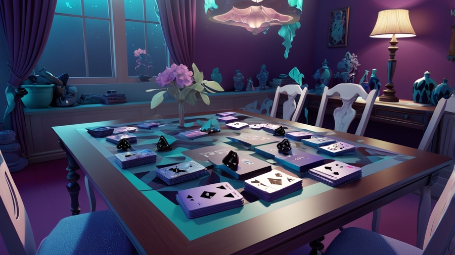 Промпт: 3d visualization for a board game based on pushkin’s story «queen of spades» with a field, cards, chips on the table with a creepy and mysterious atmosphere: anime: 1 darkmatter: 1 deepsea: 1 dangerous: 1 davinchi: 1 cyberpunk: 1 blacklight: 1 blindinglight: 1 candlelight: 1 mintcolor: 1 lavendercolor: 1 indigo: 1 --ar 16:9 --v 4