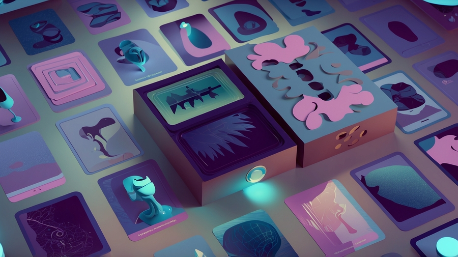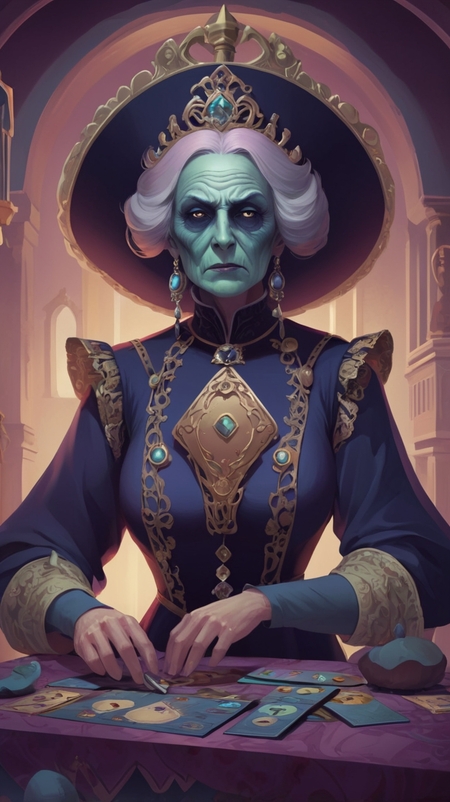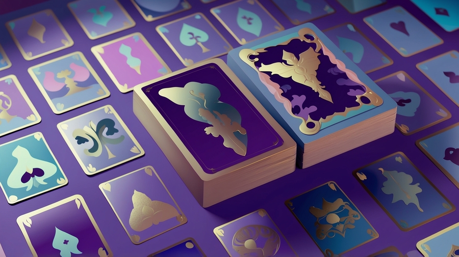 Промпт: Cards - Format: Standard size cards (63×88mm) for comfort in hand. - Card Design: - Destiny Cards: Each card features a unique symbol or artifact with a description of the effect. The background is a deep purple with gold accents. - Action Cards: Brightly colored illustrations showing an action (such as exchanging cards). Colors are green and blue with cream text. - Event Cards: Dark backgrounds (red or black) with disturbing illustrations that create a sense of danger. Text is white or gold for contrast.