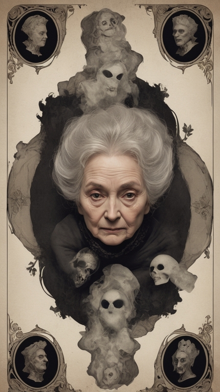 Промпт: Create a cover and layout for a board game box based on Pushkin’s novel «Queen of Spades» with the image of a creepy old woman