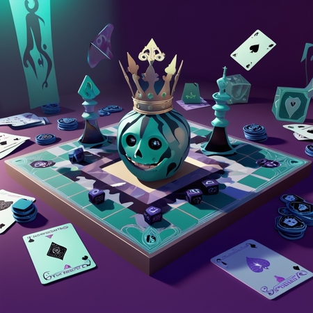 Промпт: 3d visualization for a board game based on pushkin’s story «queen of spades» with a field, cards, chips with a creepy and mysterious atmosphere: anime: 1 darkmatter: 1 deepsea: 1 dangerous: 1 davinchi: 1 cyberpunk: 1 blacklight: 1 blindinglight: 1 candlelight: 1 mintcolor: 1 lavendercolor: 1 indigo: 1