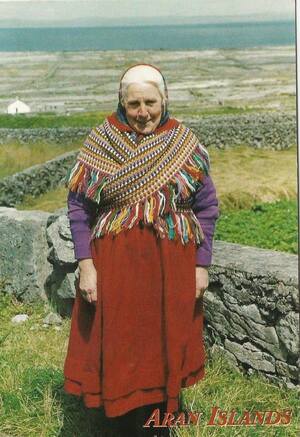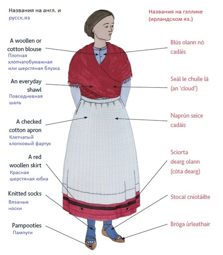 Традиционный образ ирландкской крестьянки 19-20 в. в. состоял из хлопковой или шерстяной блузы, длинной нательной рубахи, которая из-за дороговизны ткани могла изготавливаться из переработанных мешков для муки. Юбка изготавливалась из домотканной шерси и подвятывалась тканым поясом crios. Цвет юбки указывал на статус женщины: синие носили незамужние, красные, окрашенные мареной — женщины после замужества. Красный цвет также имел мифологическое значение: его носили, чтобы отпугнуть фей. Зажиточные женщины могли позволить себе иметь вторую «воскресную» юбку, которая надевалась по праздникам.