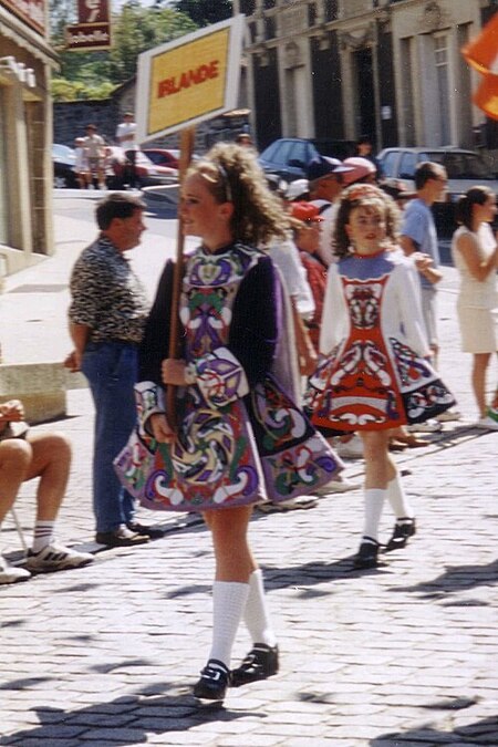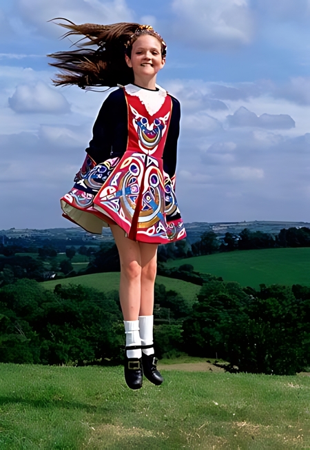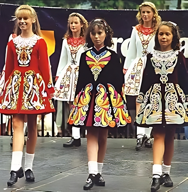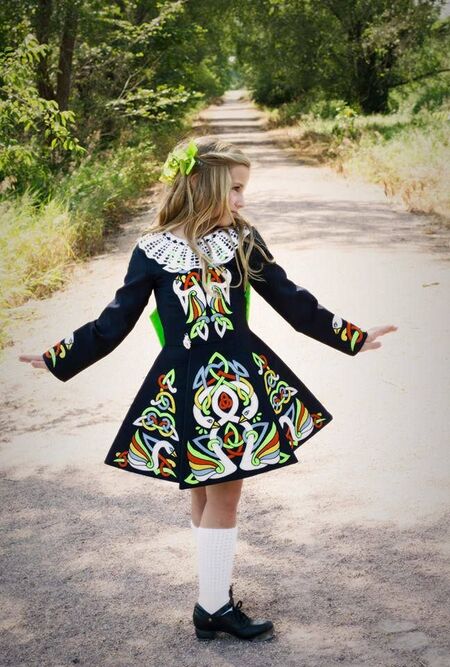В концепции исследования я говорила о том, что одежда, расшитая кельтскими знаками, не исторична. Однако есть одно исключение, а именно — костюмы для Ирландского танца, точнее, определённая их форма, созданная для конкурсов в 20 веке. В данном случае можно говорить о самоэкзотизации ирландской культуры: яркие традиционные цвета, кружевные воротнички и узнаваемые кельтские символы находятся на грани китча, демонстрируя все стереотипные символы ирландской культуры сразу. Однако в контексте представления, танцевального шоу это выглядит уместно. Зародившаяся в середине 20 века мода на такие костюмы жива до сих пор.